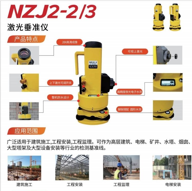 DZJ-300A可廣泛應用于建筑施工、工程安裝、工程監理、變形觀測。如:高層建筑、電梯、礦井、水塔、煙囪、大型設備安裝、飛機制造、造船等行業。 性能特點: ...